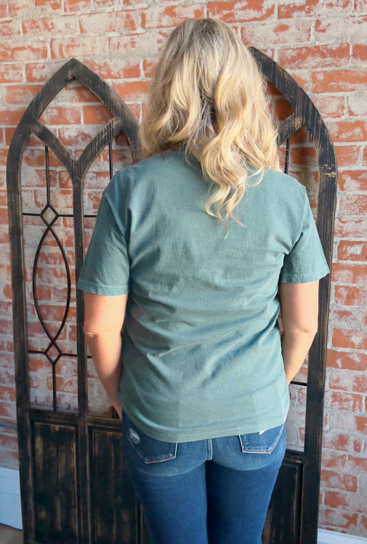 - Blue spruce colored bodice with distressed black and white checkered print and a pink tree decal