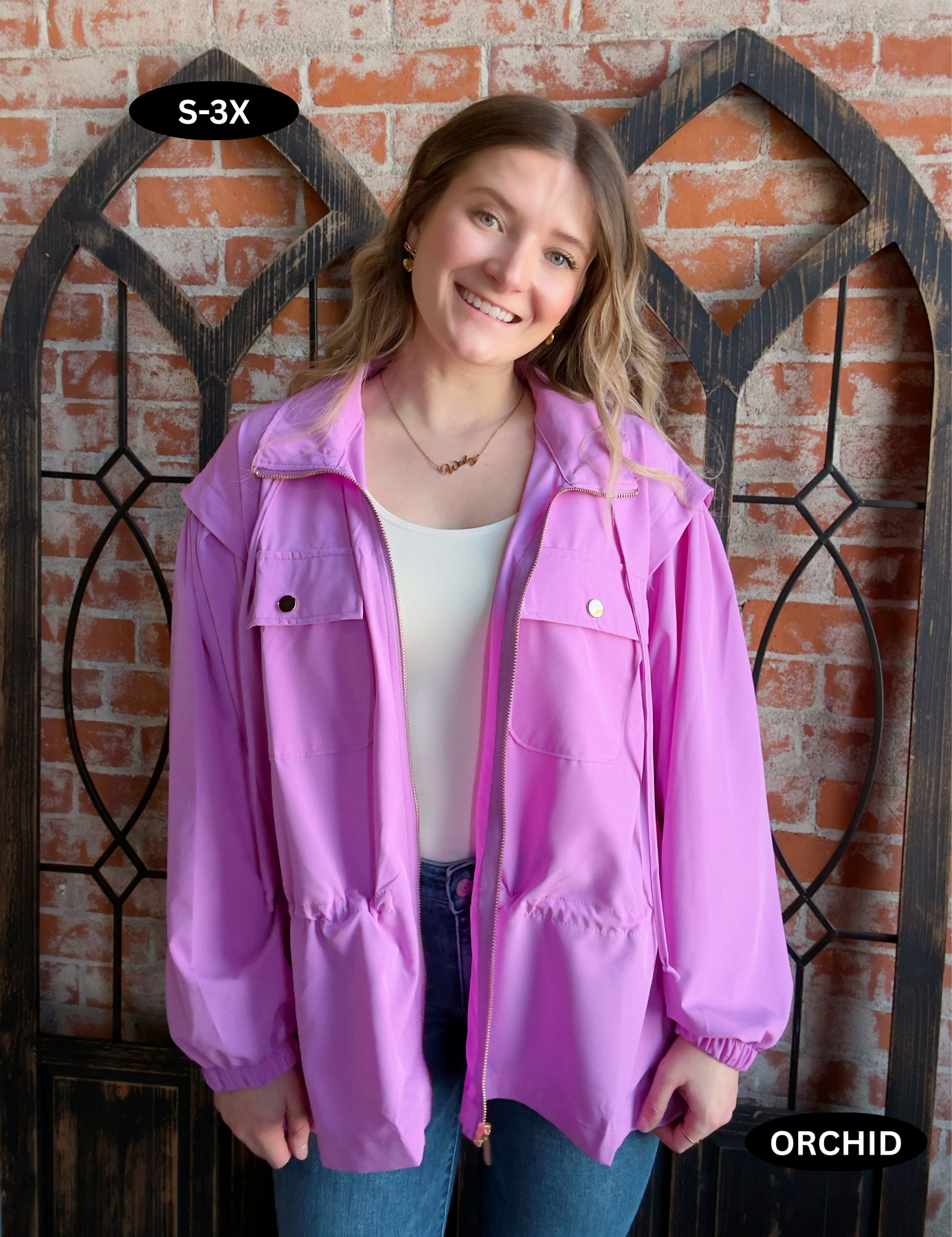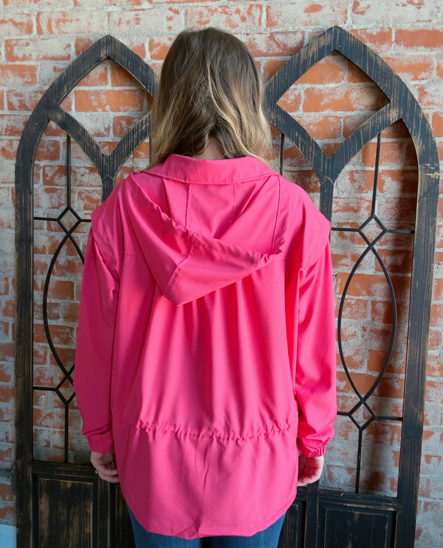 - Attached hood with functional full zip details and drawstring accents