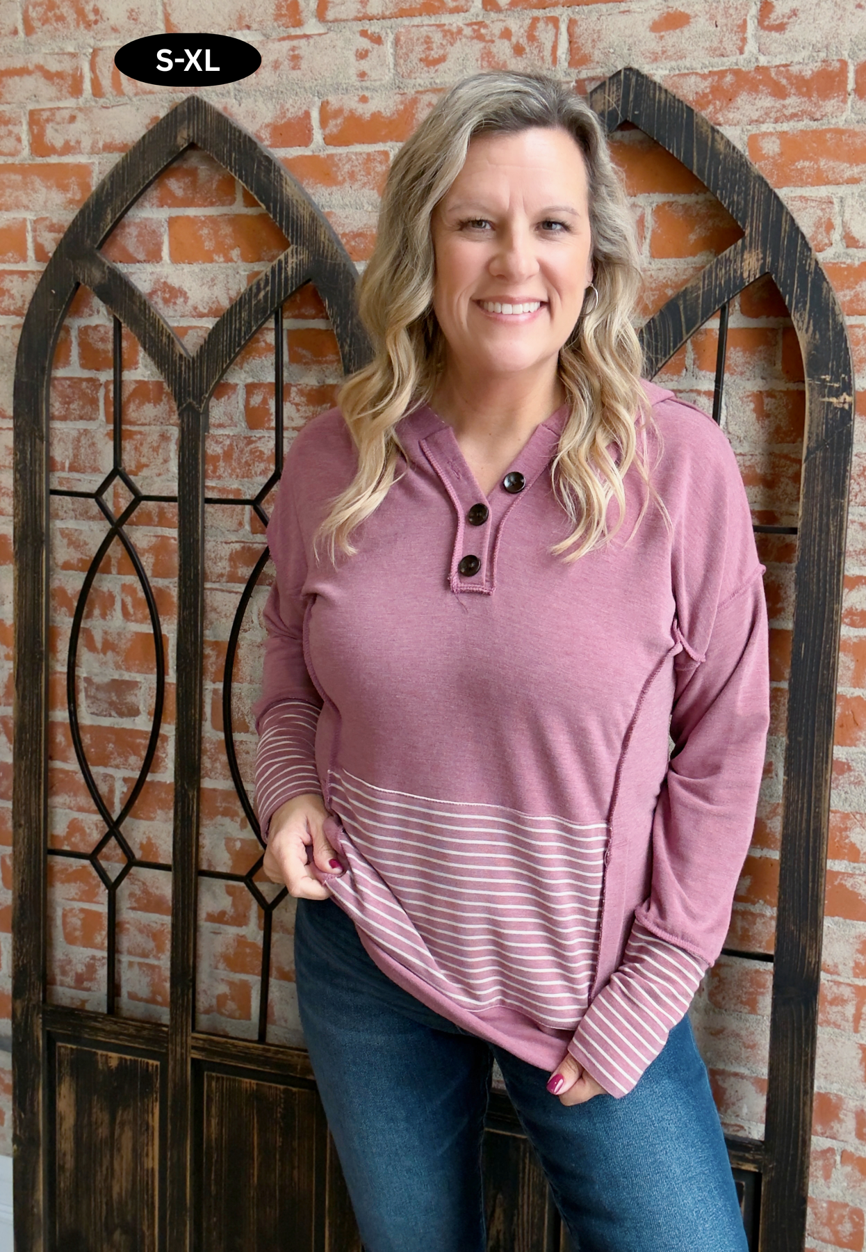 - Attached hood with faux quarter button down details