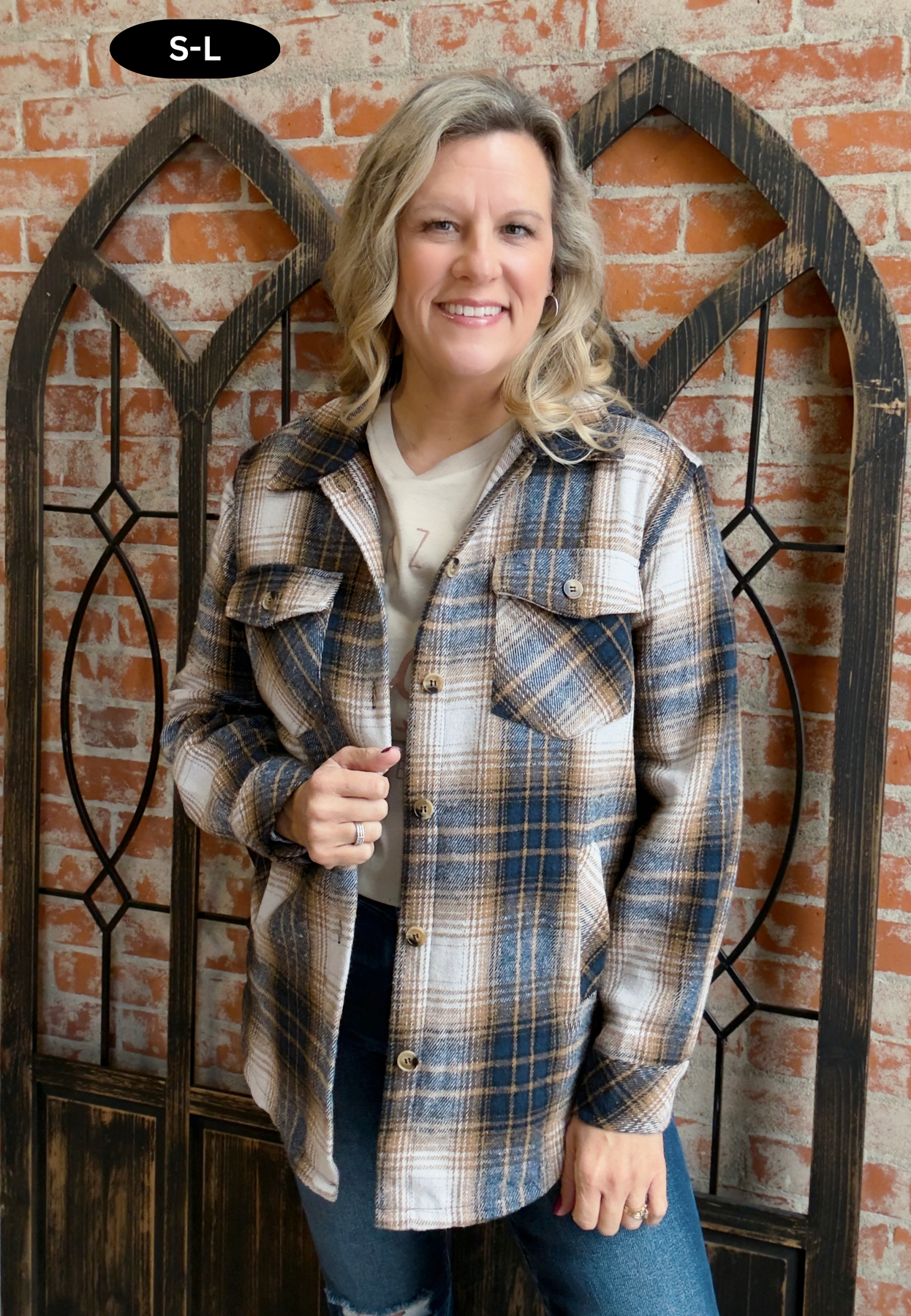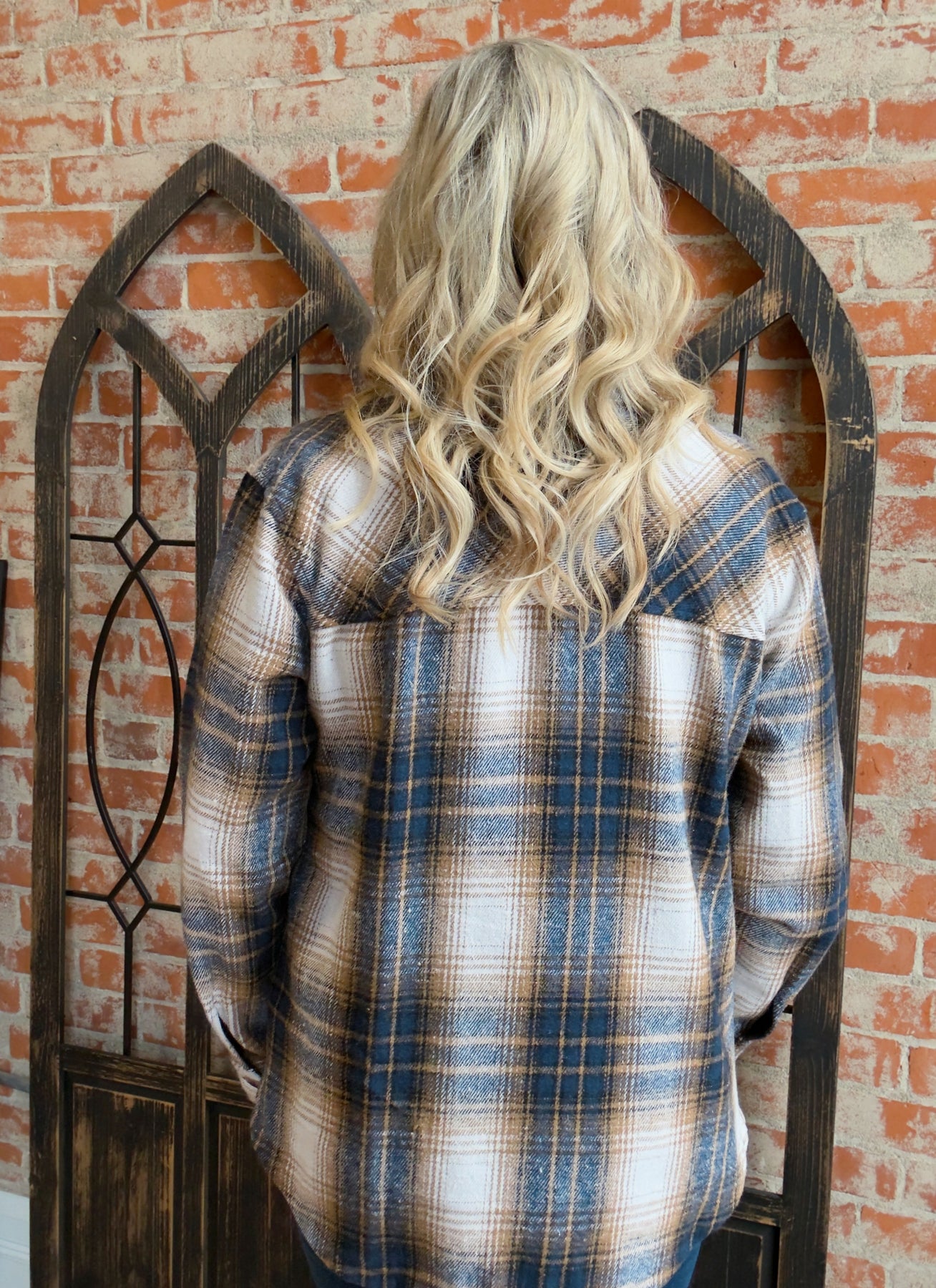 - Camel/navy/ivory plaid bodice
