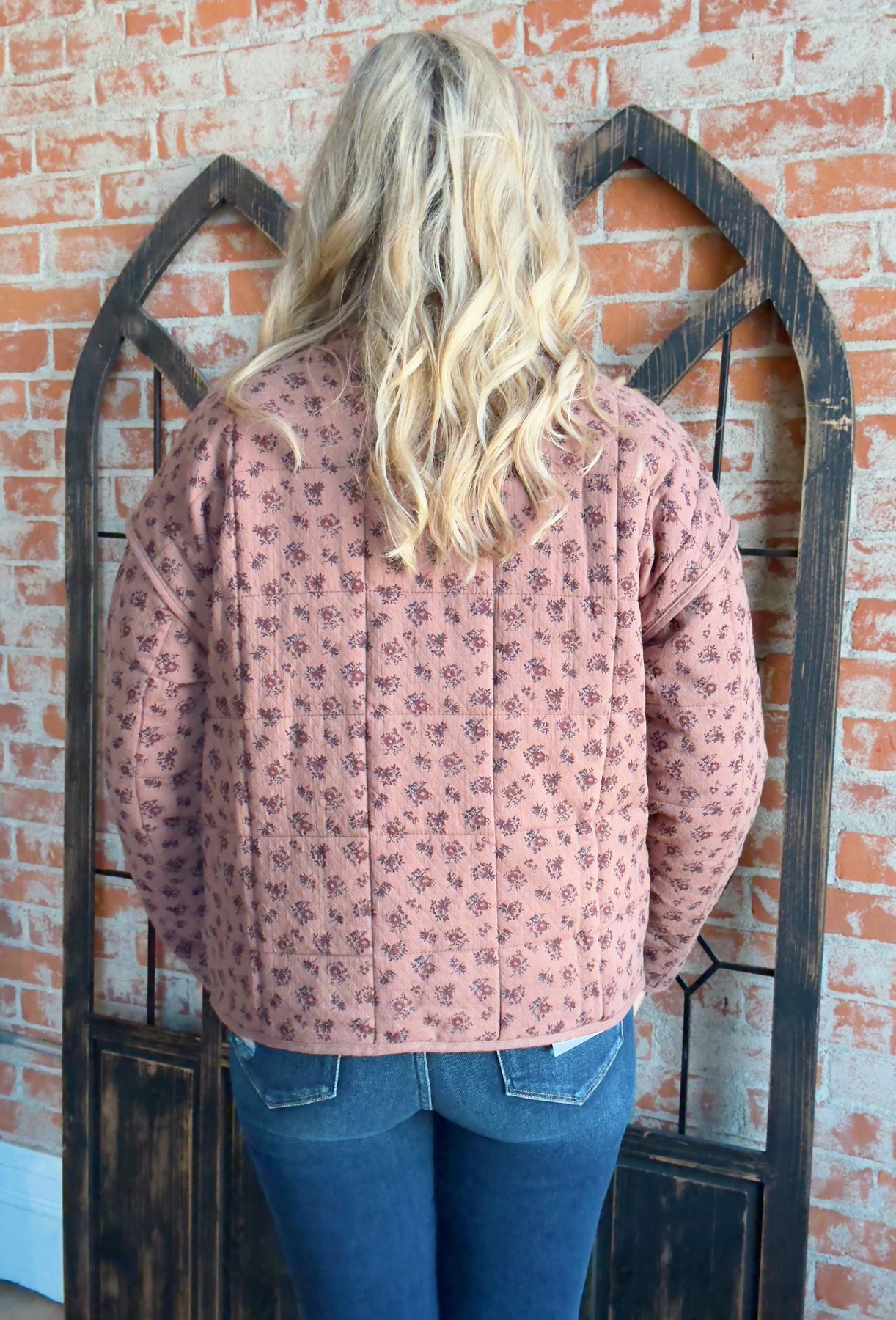 - Mauve in color with brown/black ditsy floral print throughout