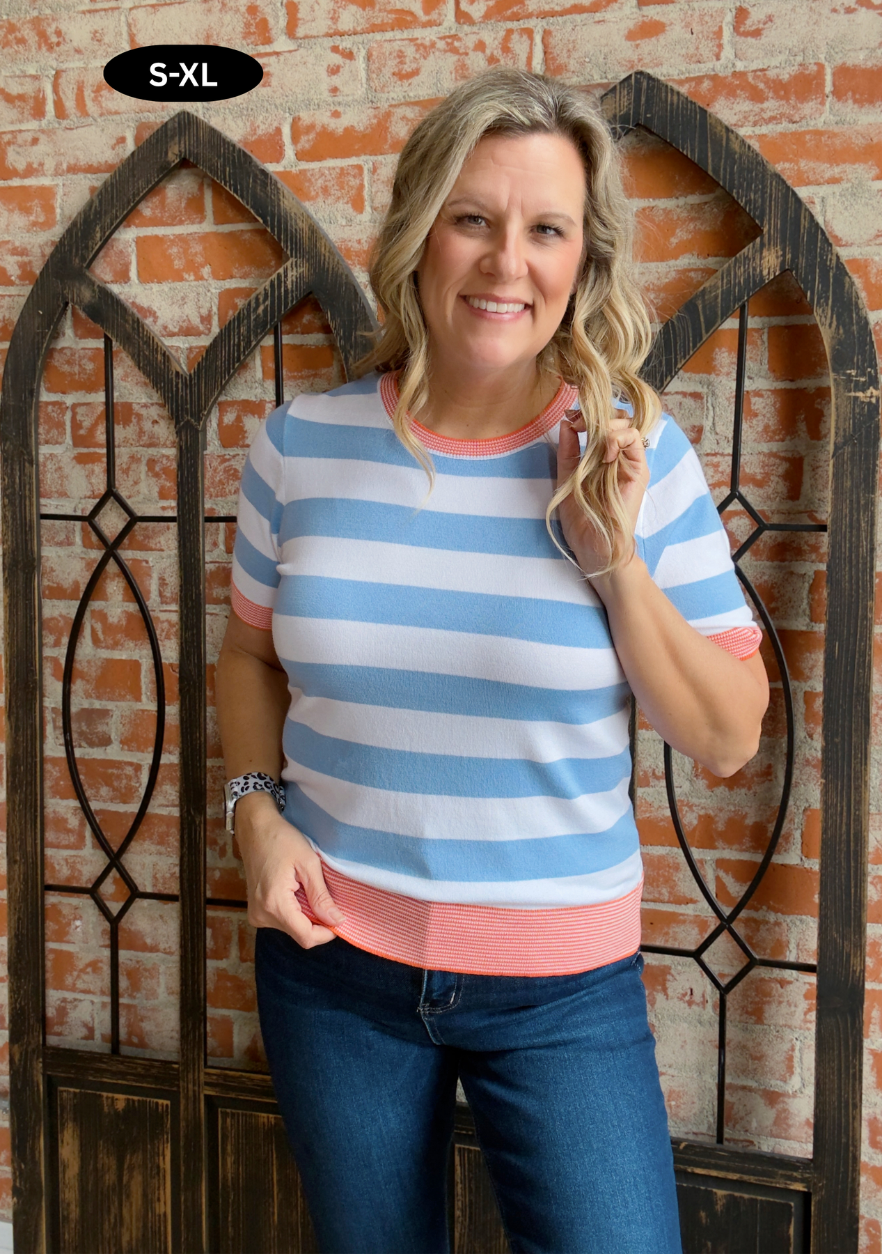 • Ivory/chambray striped bodice with orange trim