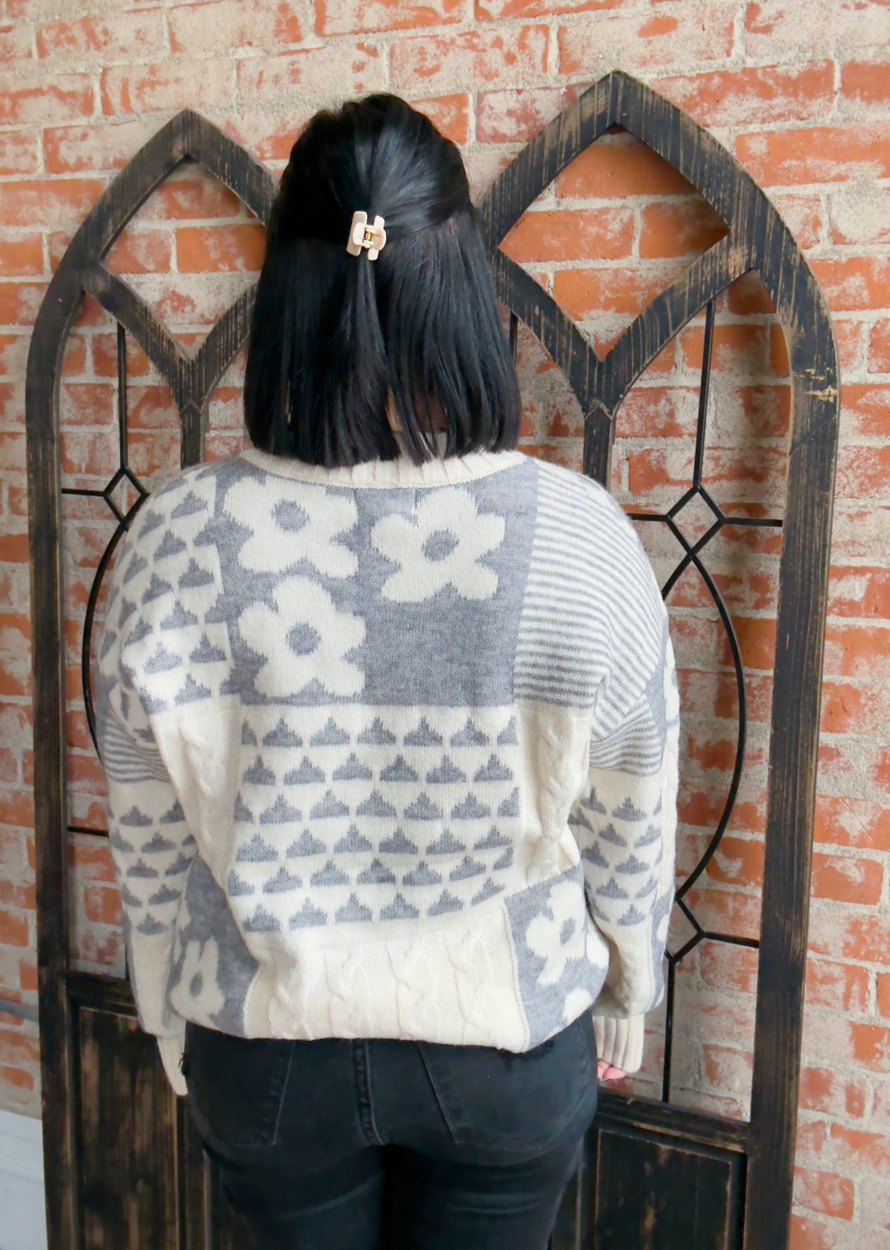 • Color block details of ivory/h.grey/daisy print with subtle cable knit details