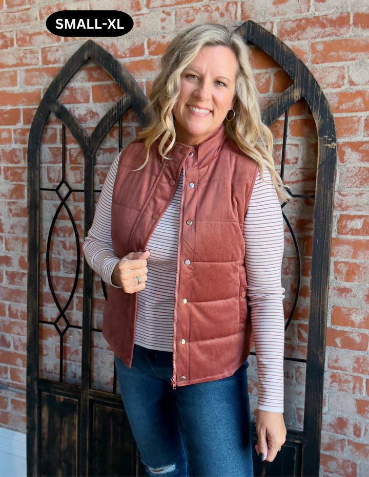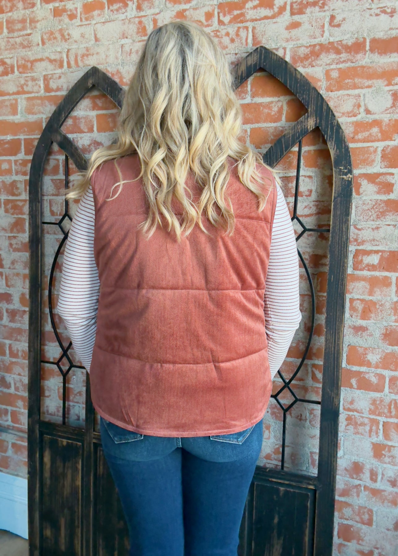 - Soft, medium weight quilted puffer vest that contains limited stretch. Velvety-corduroy feel!
