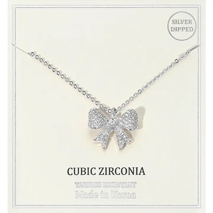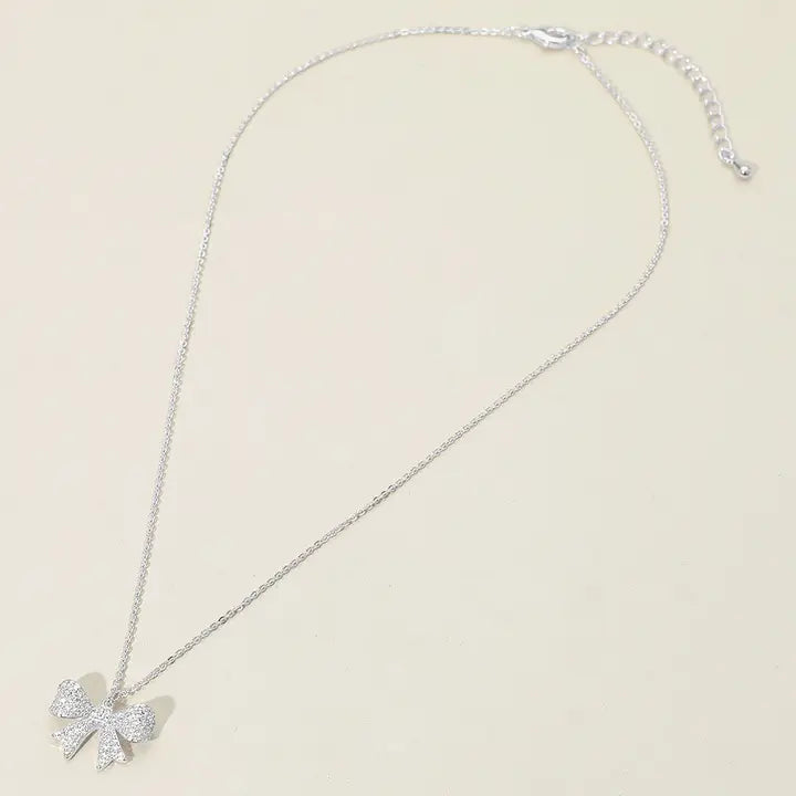 18K Gold Dipped Pave Bow Pendant Necklace-Silver