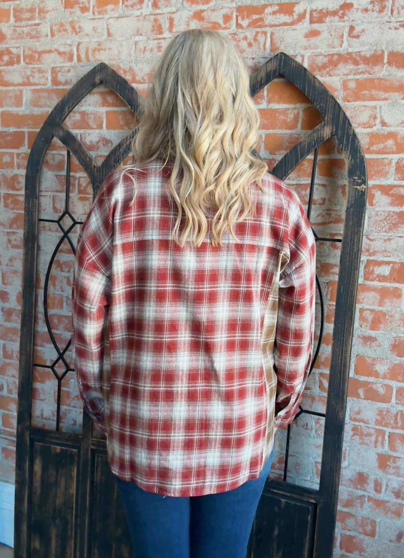 - Wine/camel/ivory plaid bodice with functional left breast pocket