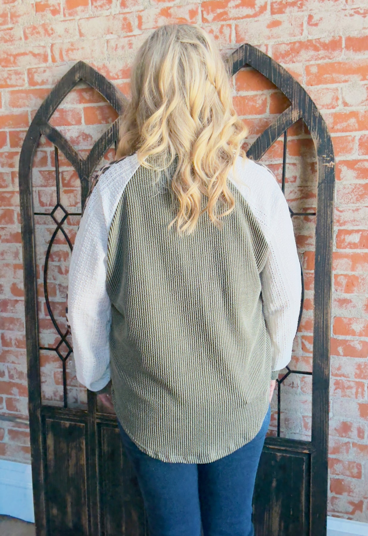 - Olive bodice with leopard print trim and ivory lace details on the sleeves