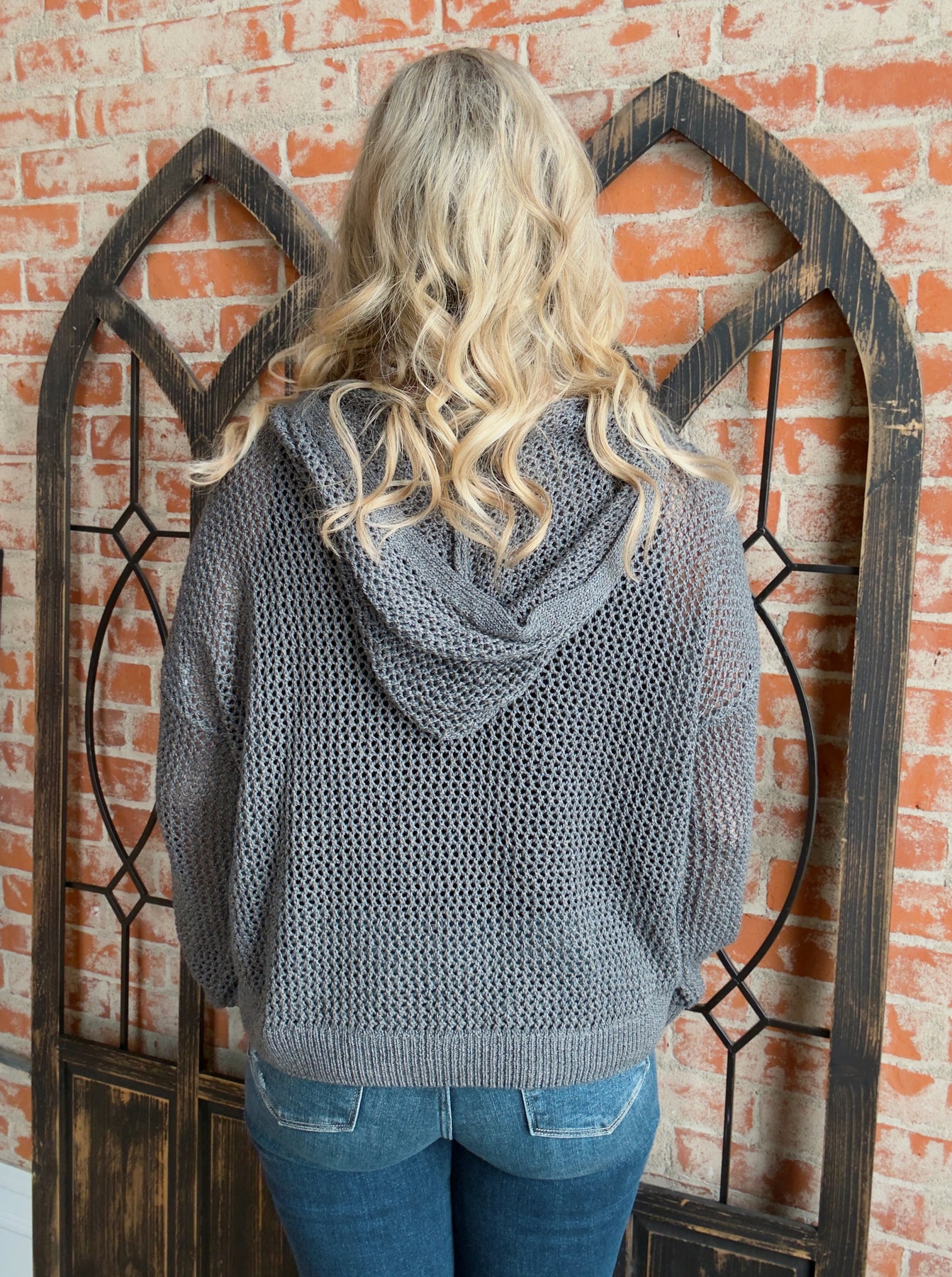 - Soft, light weight open knit sweater material that contains stretch