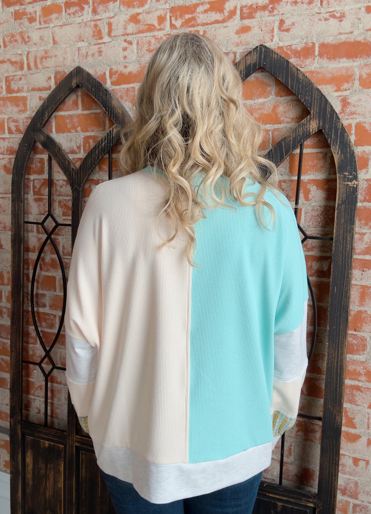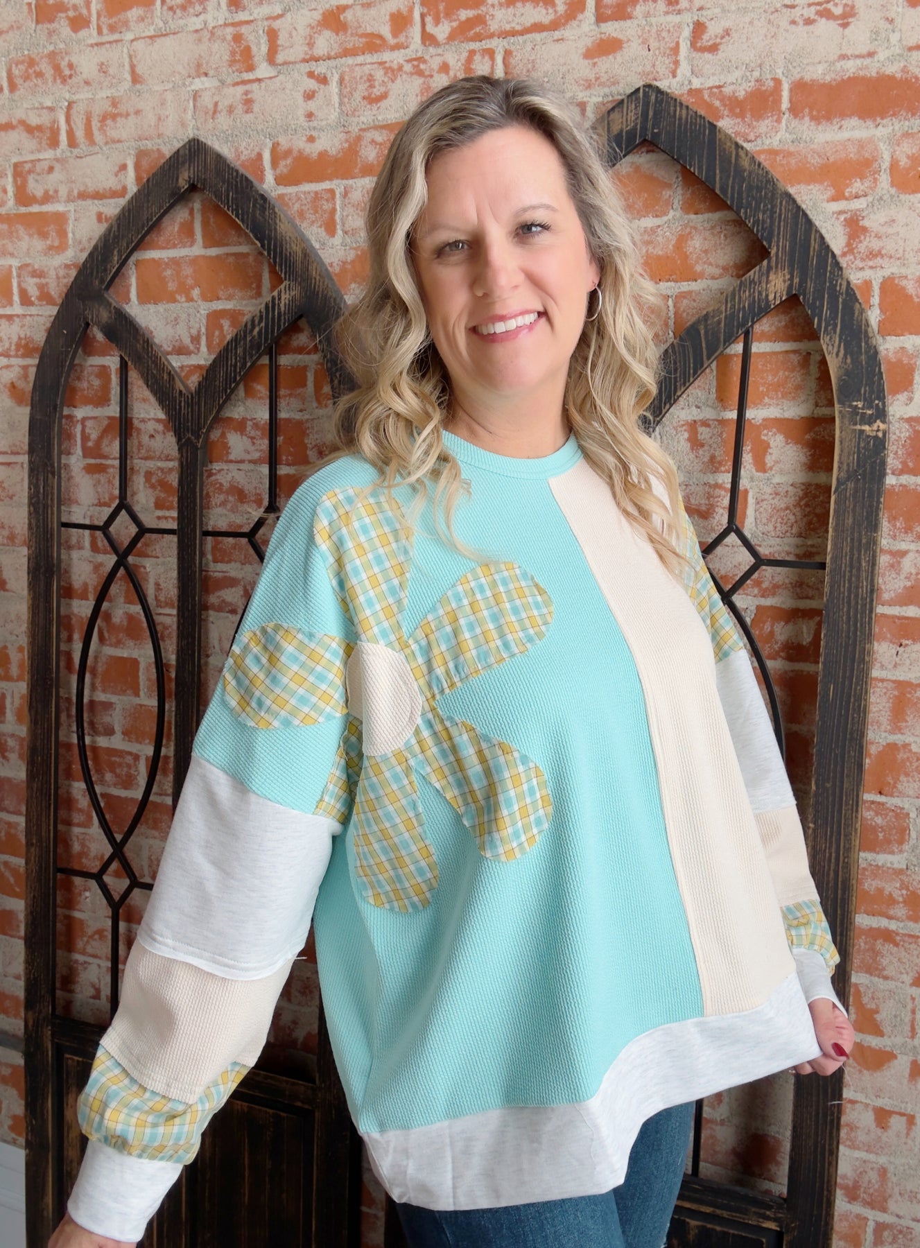 - Color block details of aqua/cream/h. grey/yellow plaid with bold daisy decal