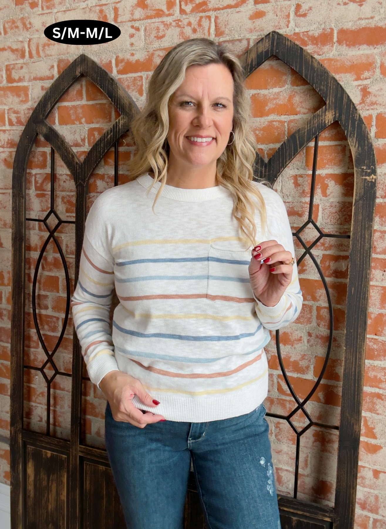 - Ivory bodice with navy/blue/brown/buttercup yellow stripes throughout